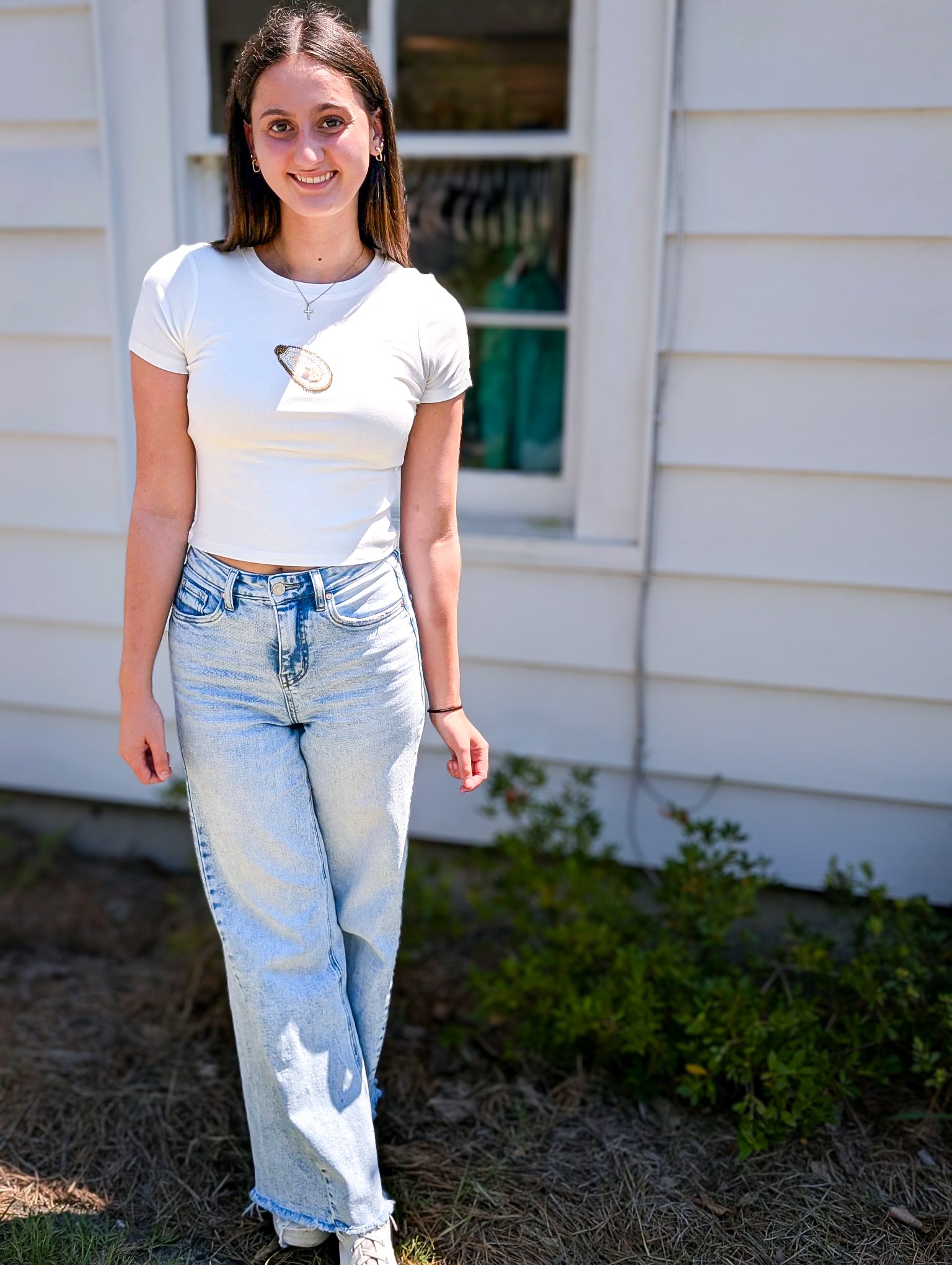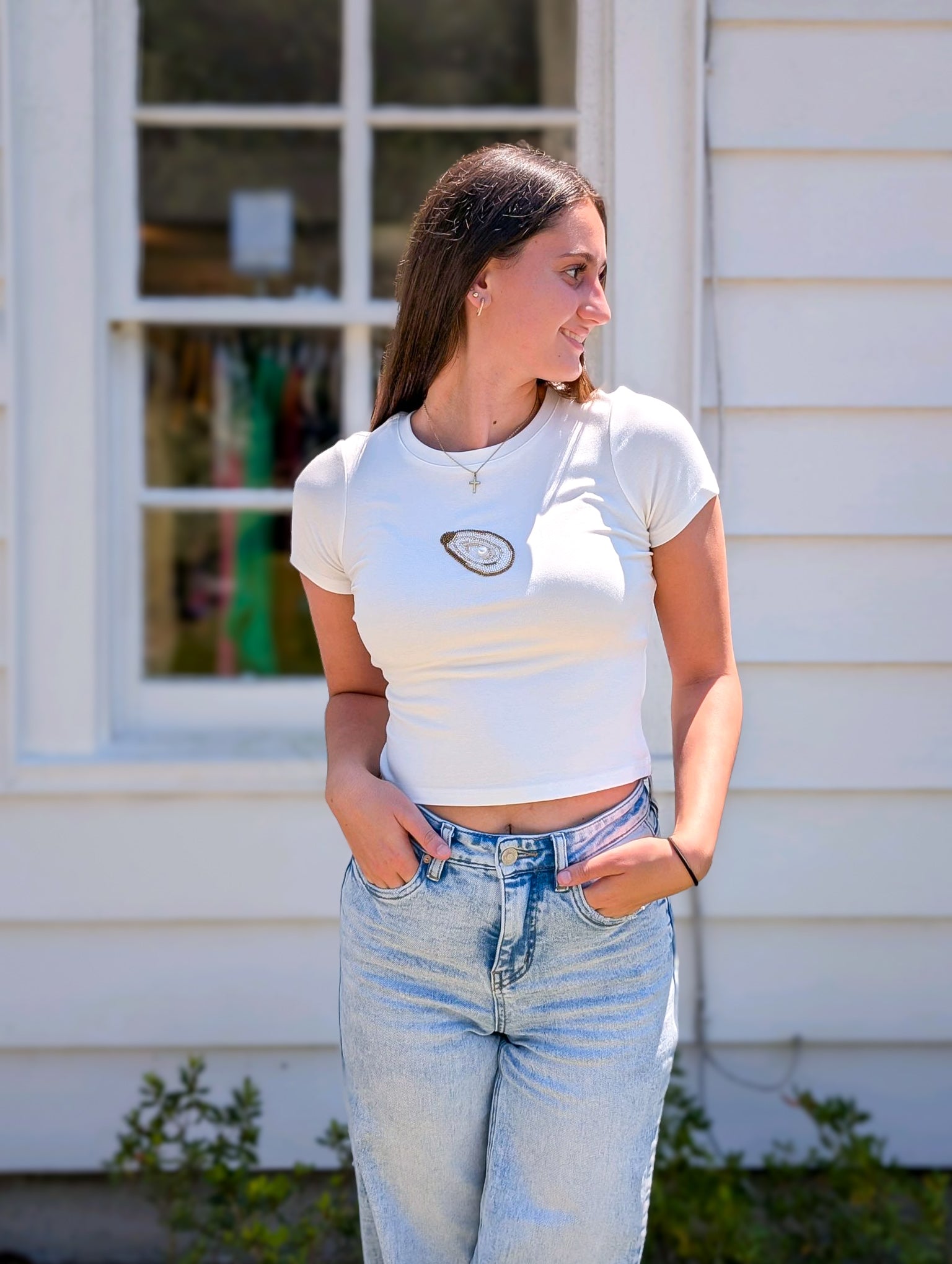 Elevate your wardrobe with our Off White Oyster Beaded Embroidered Tee! Featuring delicate beadwork and intricate embroidery, this short sleeve tee adds a touch of elegance to any outfit. The soft, off white color complements any skin tone. Upgrade your style with this stunning tee!