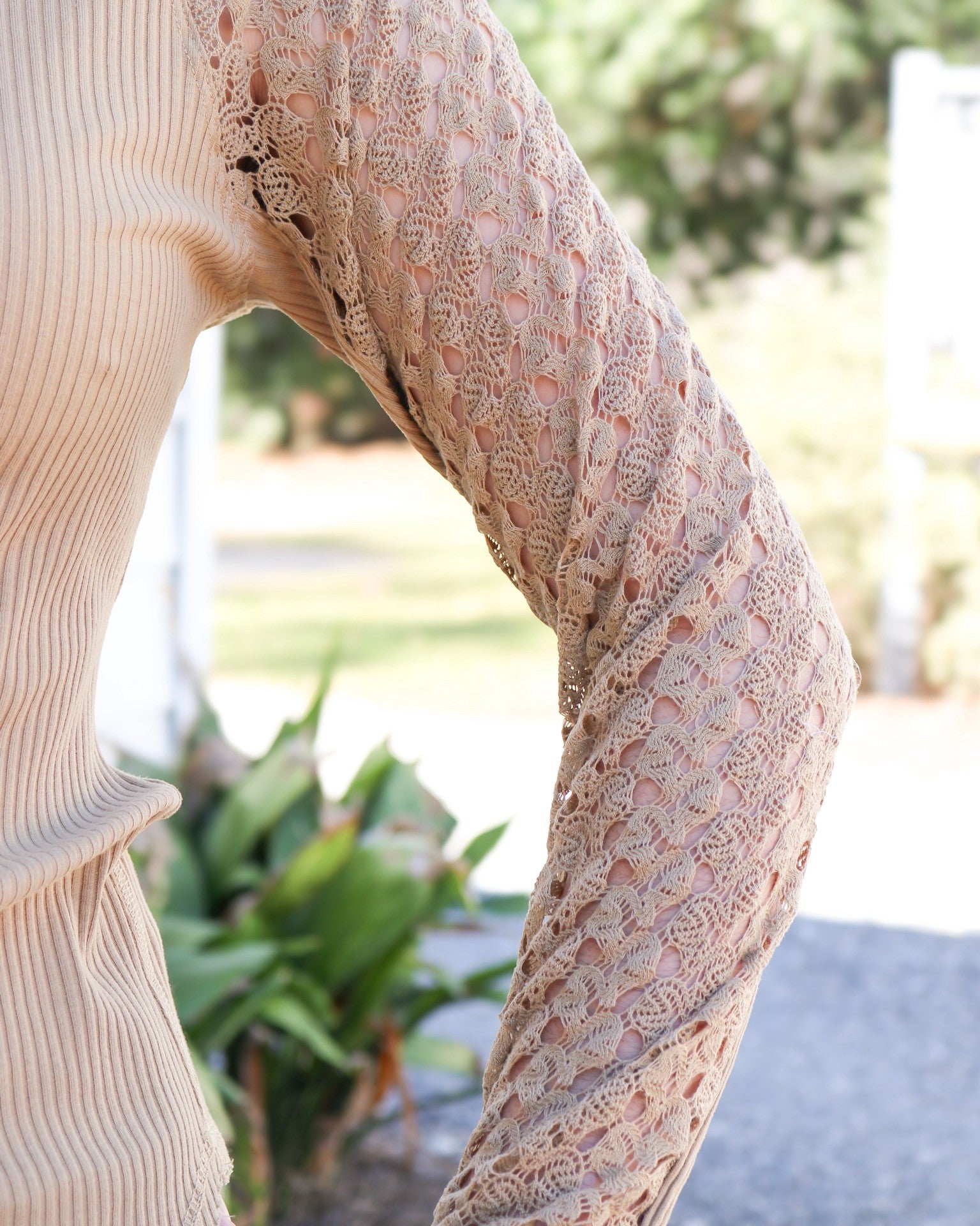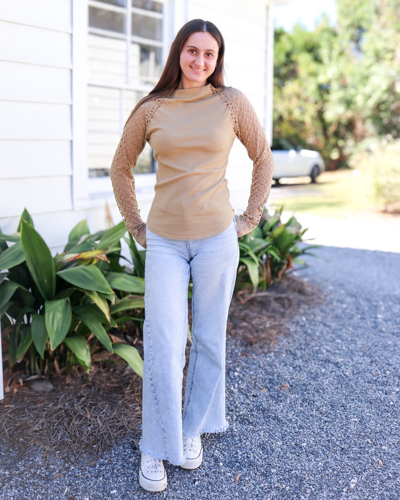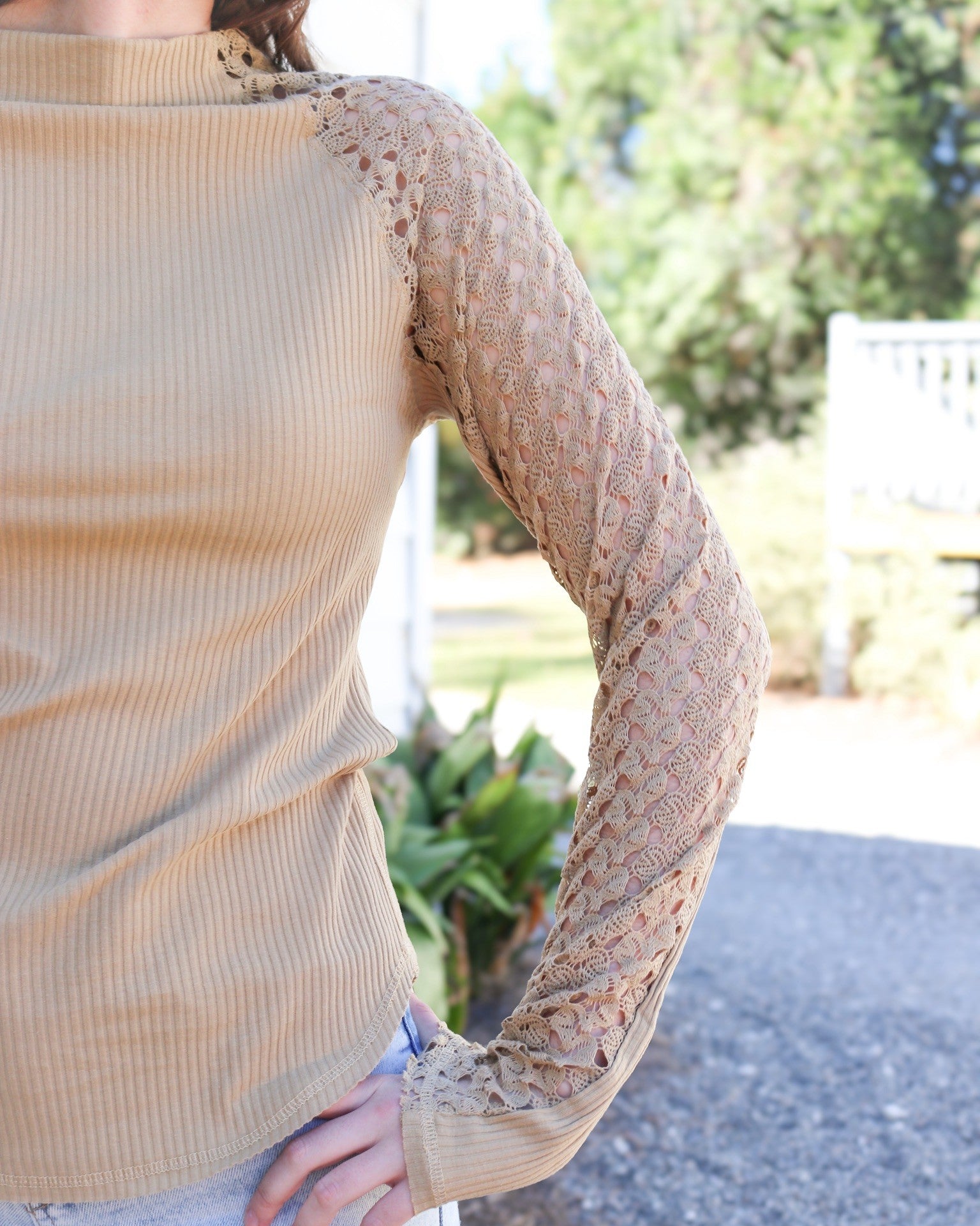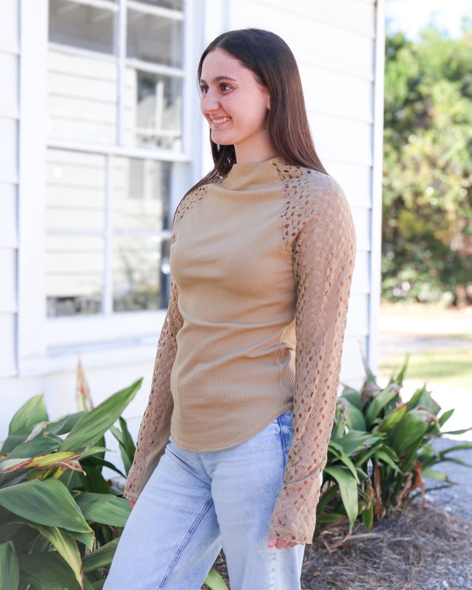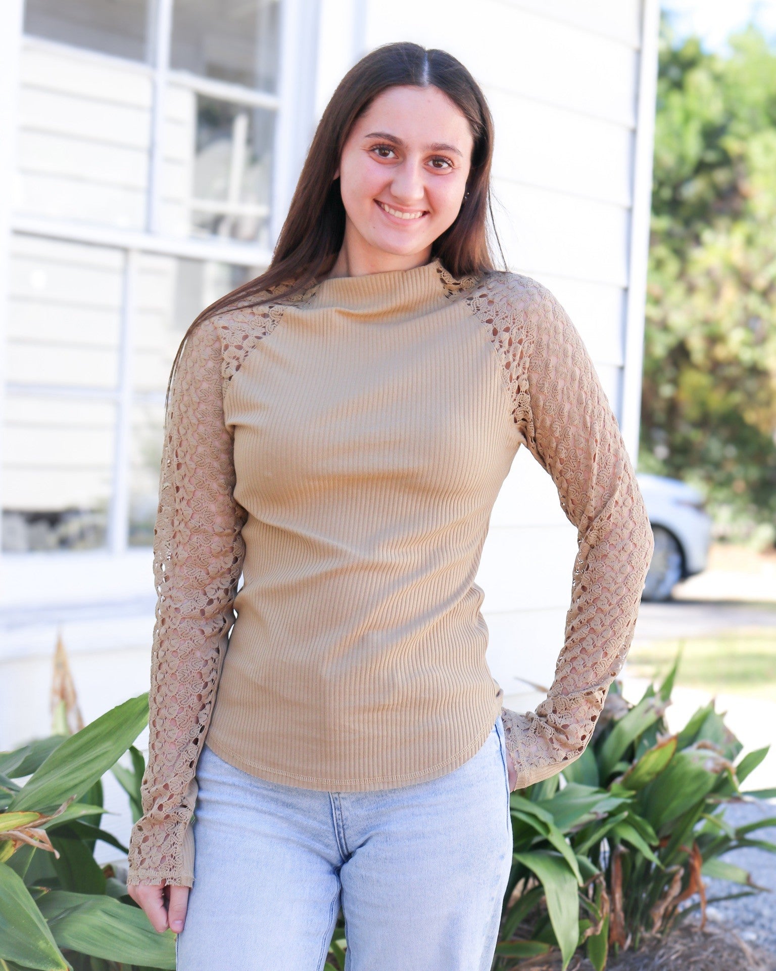 Experience cozy chic with our Tan Suri Top! This high neck, long-sleeve silhouette features delicate lace accents and a warm tan color, perfect for embracing those fall vibes. Easily layer with your favorite pieces for a stylish and versatile look. Don't miss out on this must-have addition to your wardrobe!"