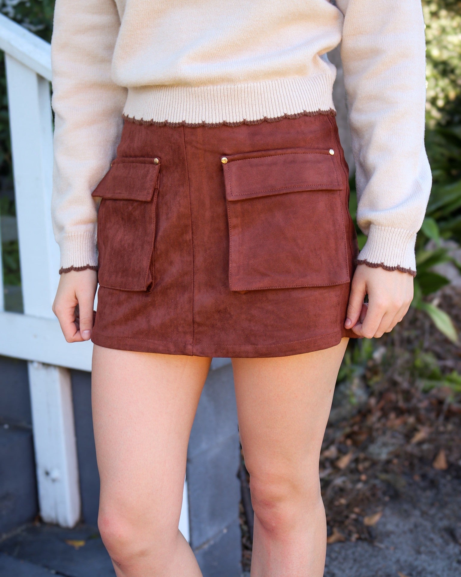 Elevate your fall wardrobe with our Brown Faux Suede Skort. This skort not only has a trendy front pockets and convenient back zipper, but also boasts a rich brown color that will add a touch of sophistication to any outfit. Embrace the fall vibes and make a statement with this versatile piece.