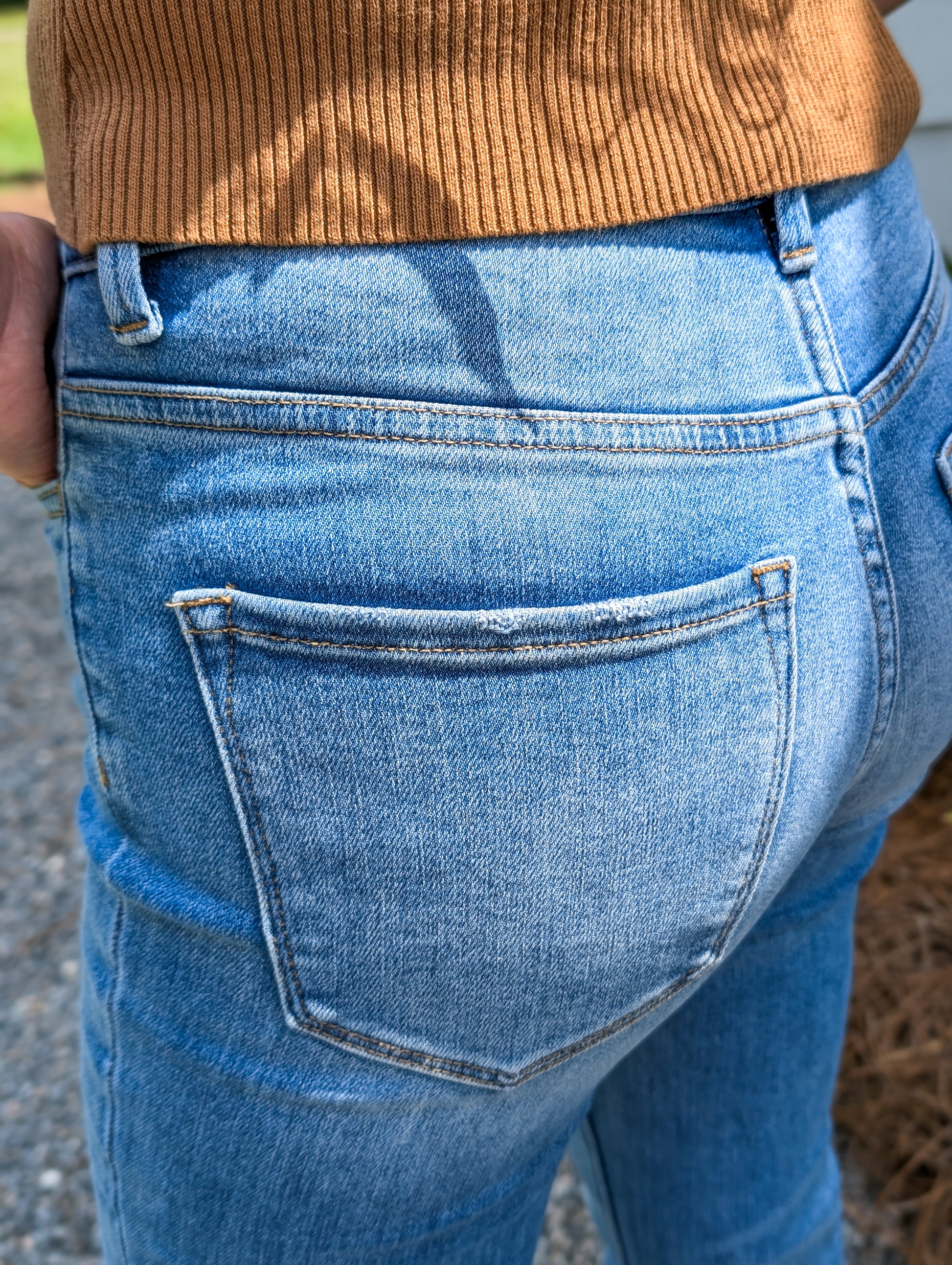 Elevate your style with our Dark Blue High Rise Flared Jeans! The high-rise waistline creates a flattering silhouette while the flared legs add a touch of vintage charm. Perfect for making a bold fashion statement and elongating your legs. Get ready to turn heads and feel confident in these stylish jeans!