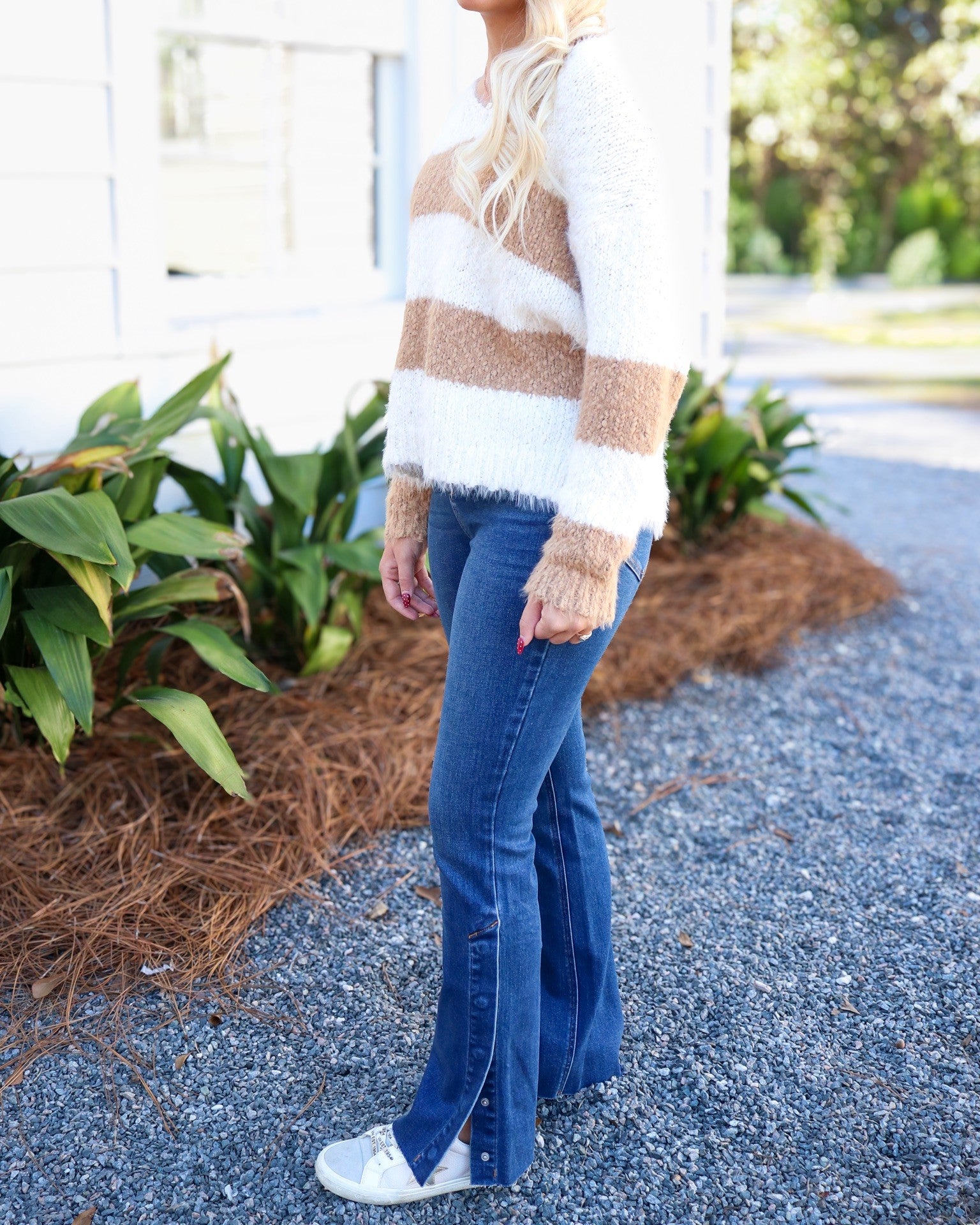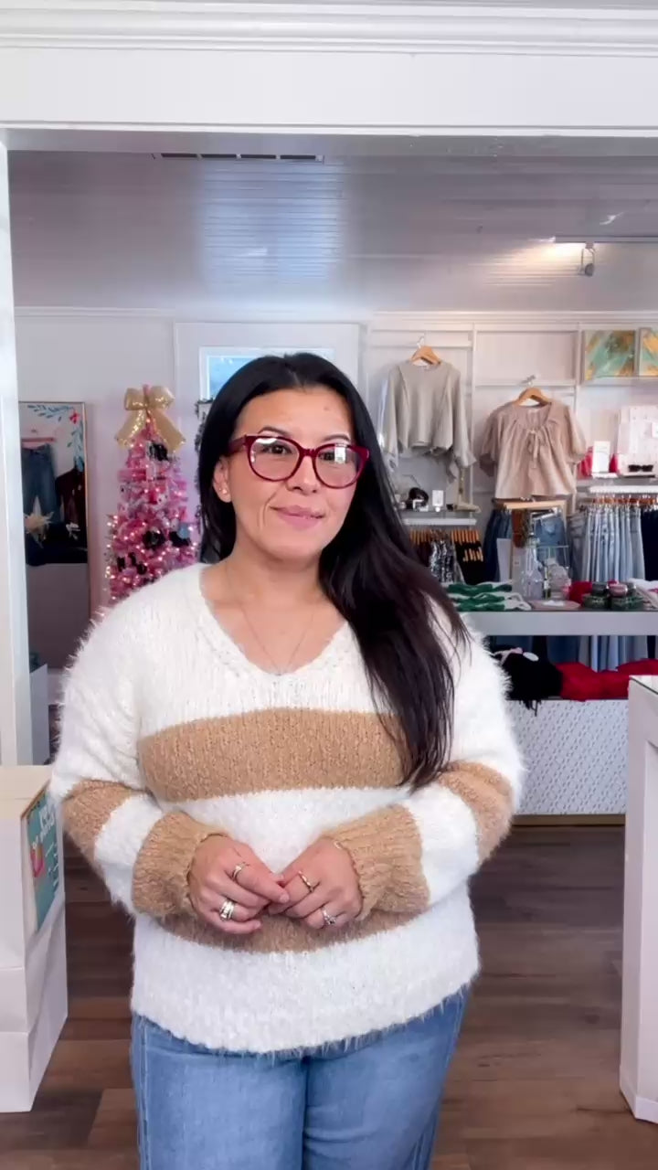 Wrap yourself in the luxurious comfort of the Emberly Fuzzy V Neck Stripe Sweater. With its soft, fuzzy fabric and cozy v neck design, this sweater is the epitome of comfort. Stay warm and stylish all season long in this must-have wardrobe essential.