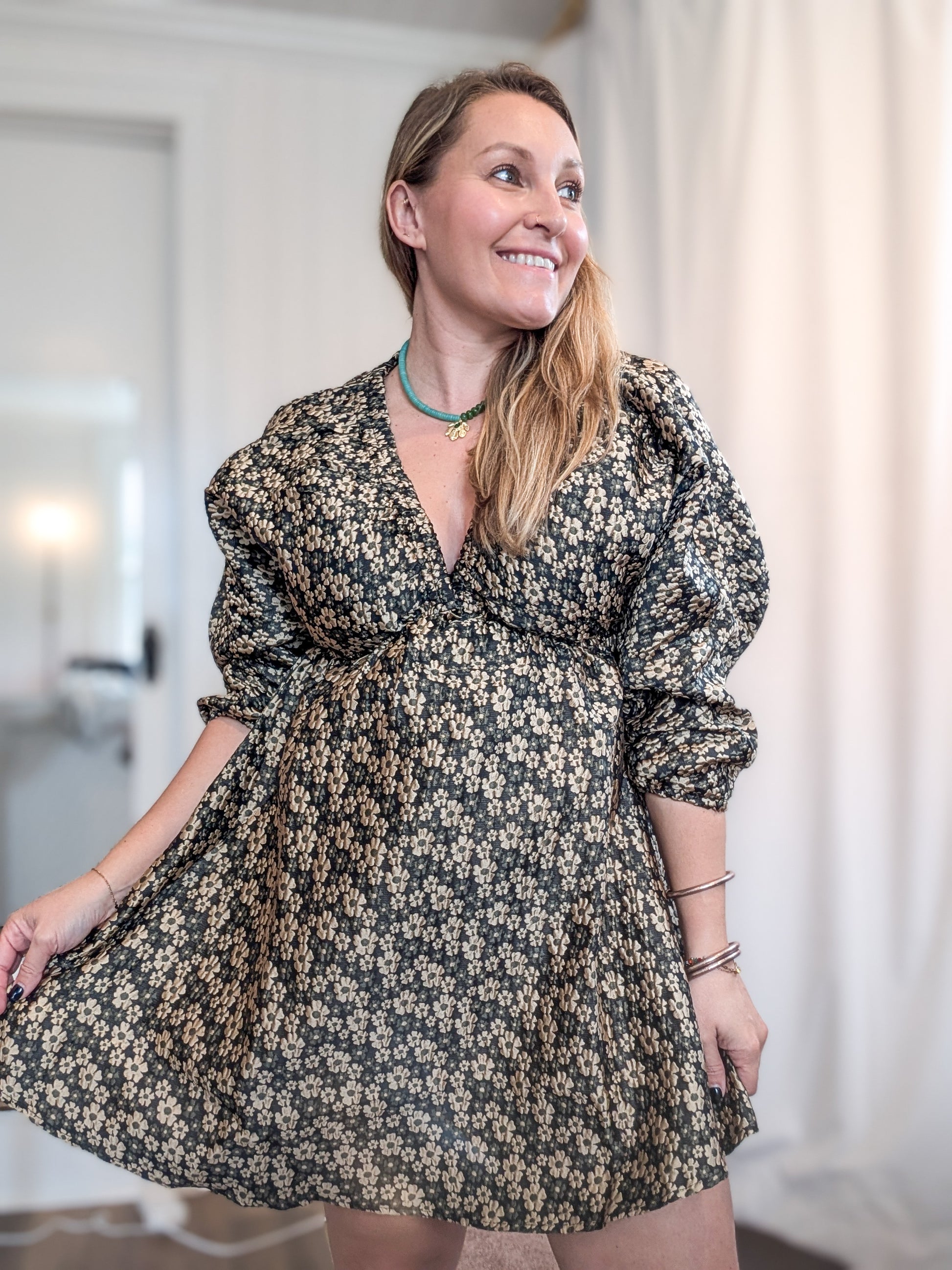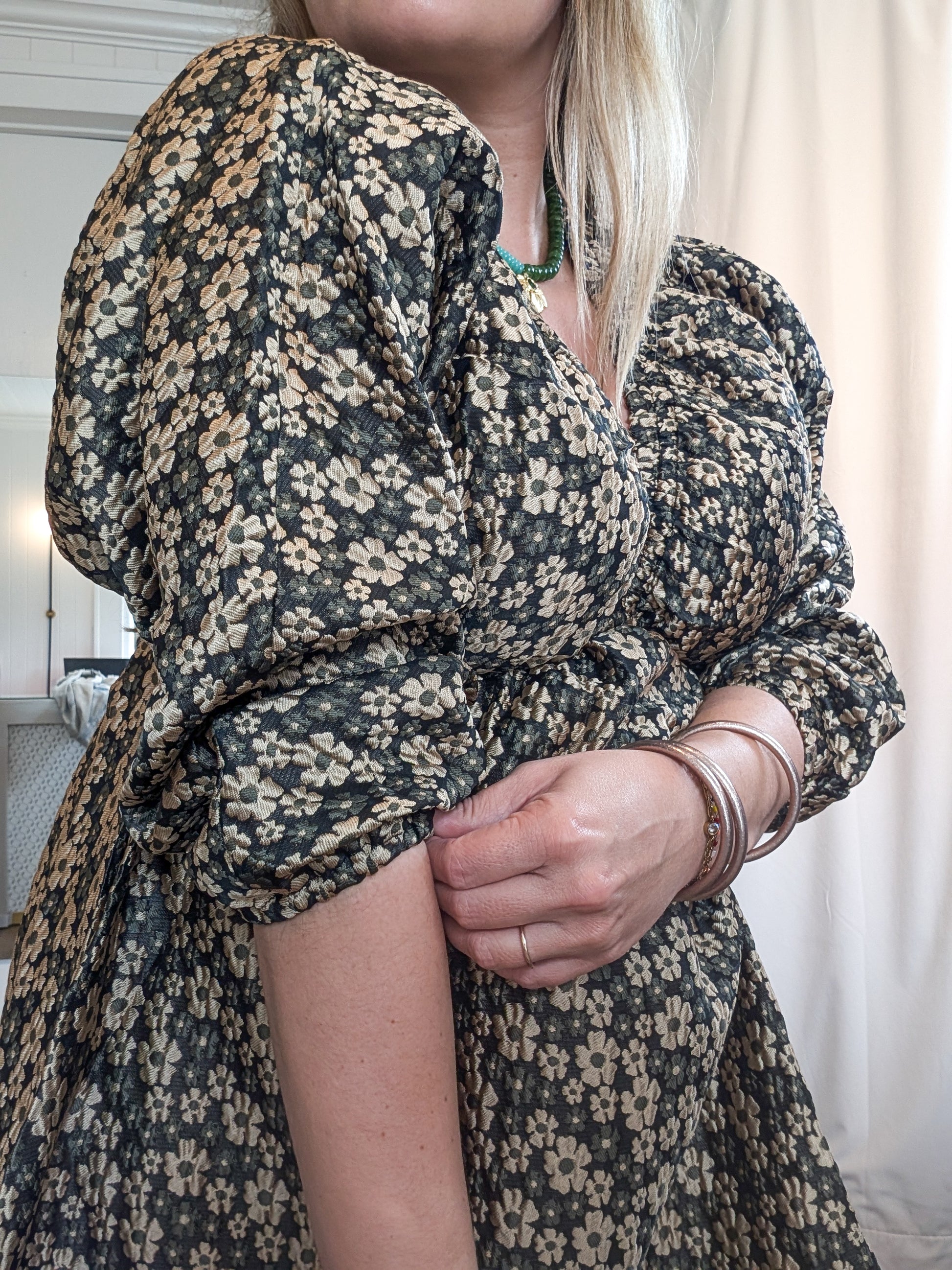 *FINAL SALE* Gold Daisy Jacquard Puff Sleeve Dress