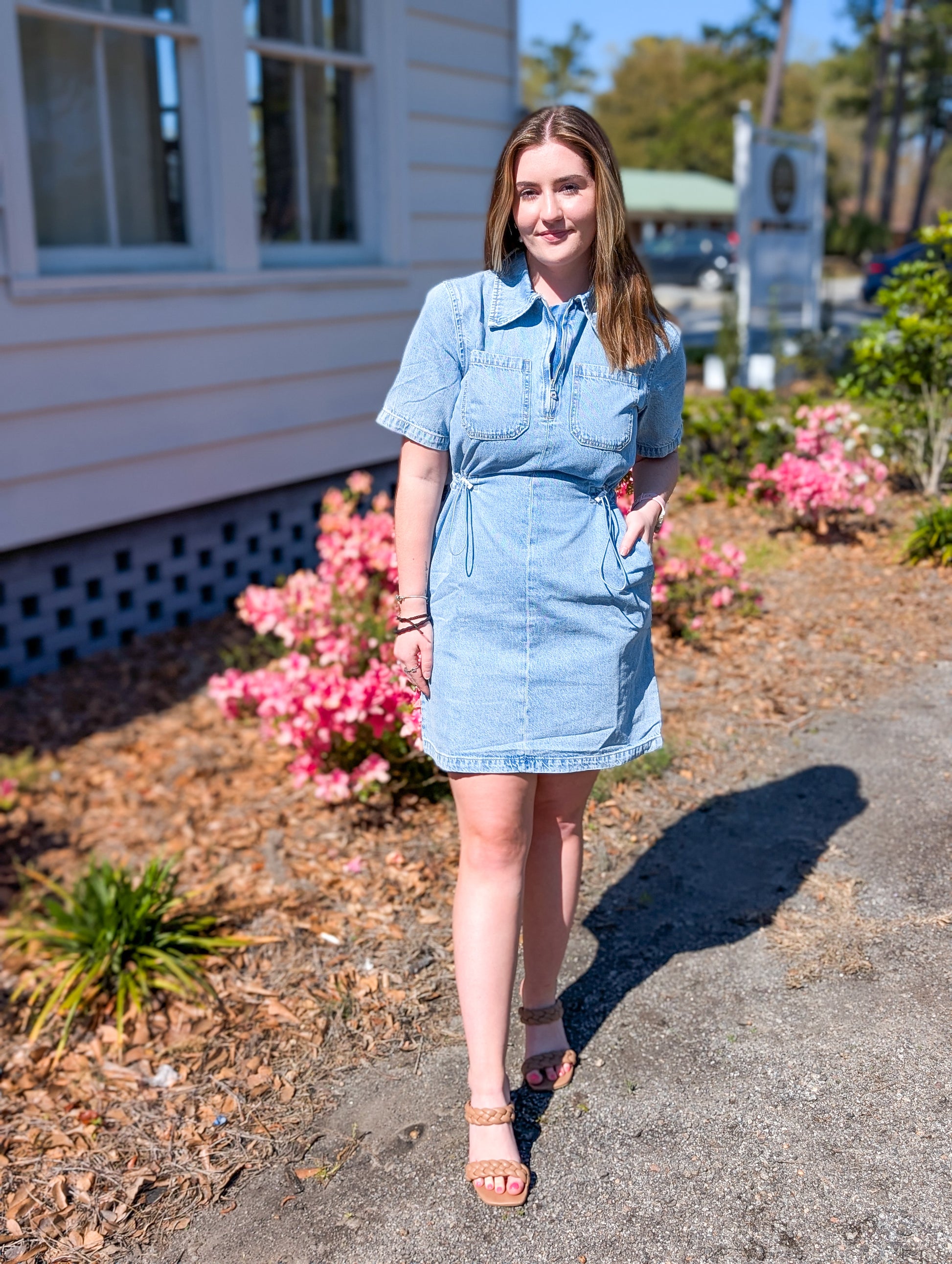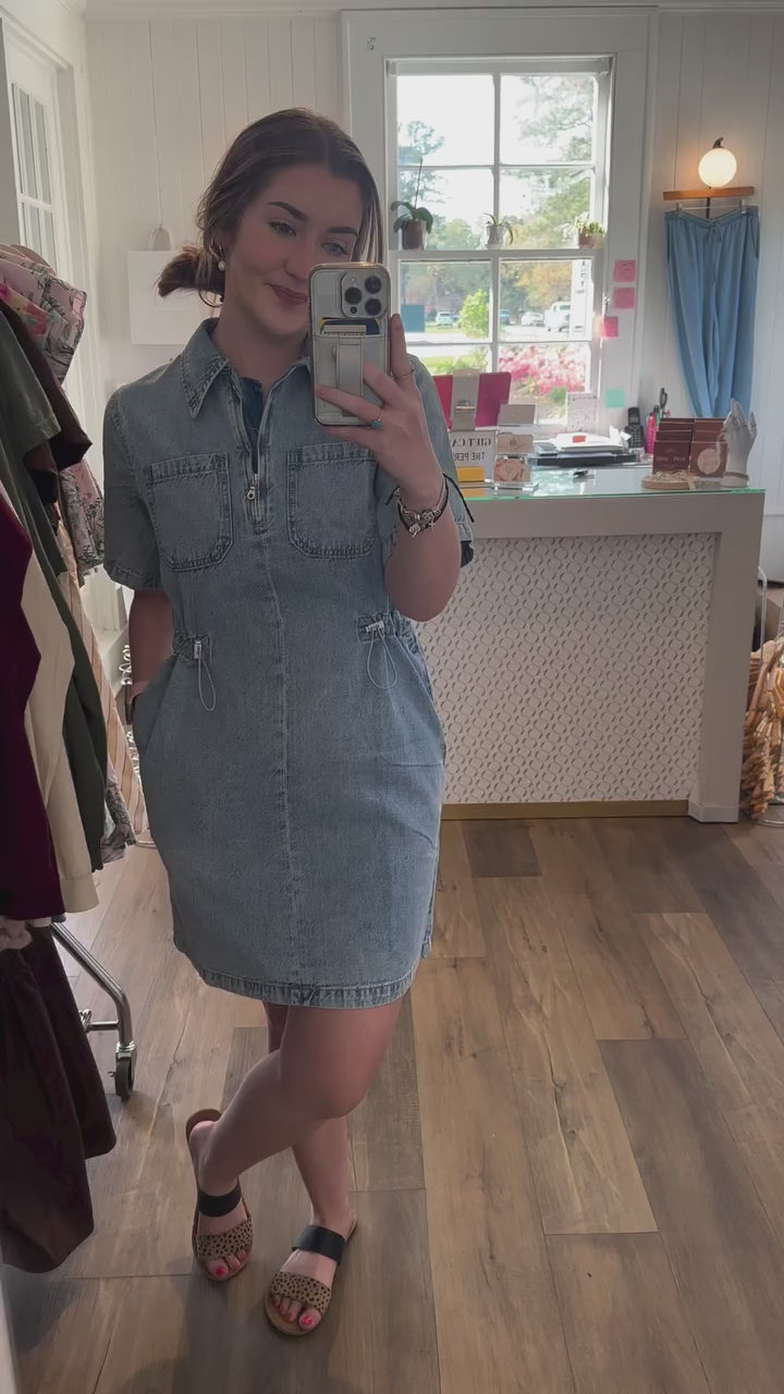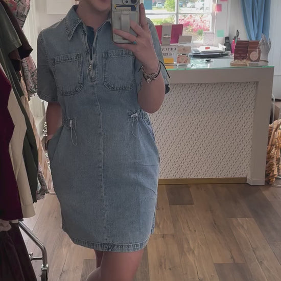 Light Denim Wash Cinch Waist Dress with Zipper Detailing