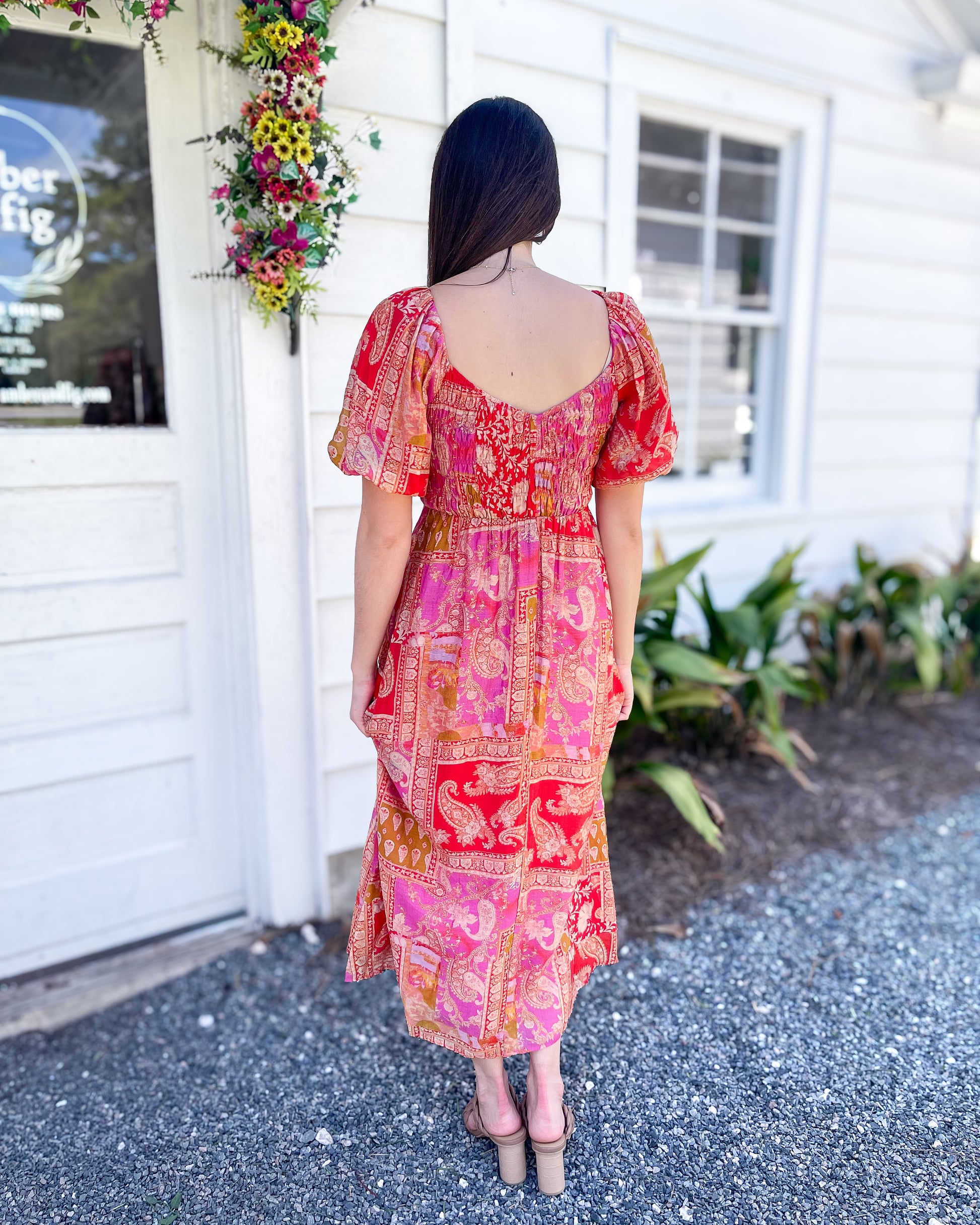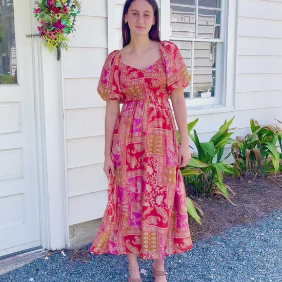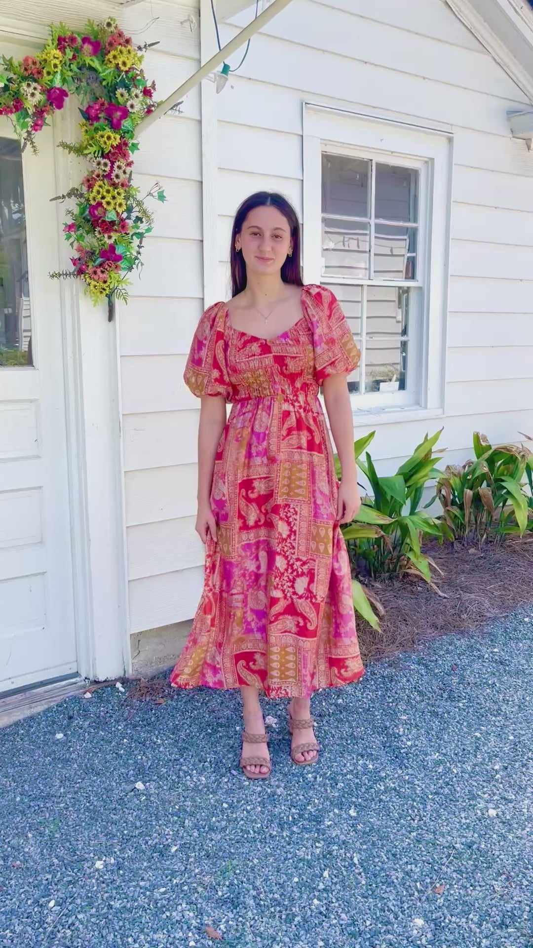 Discover the Mediterranean Majesty Puff Sleeve Maxi Dress. Experience its charming blend of vibrant pink and red hues. The romantic and bohemian vibe is complemented by the puffy sleeves, making it ideal for fall.
