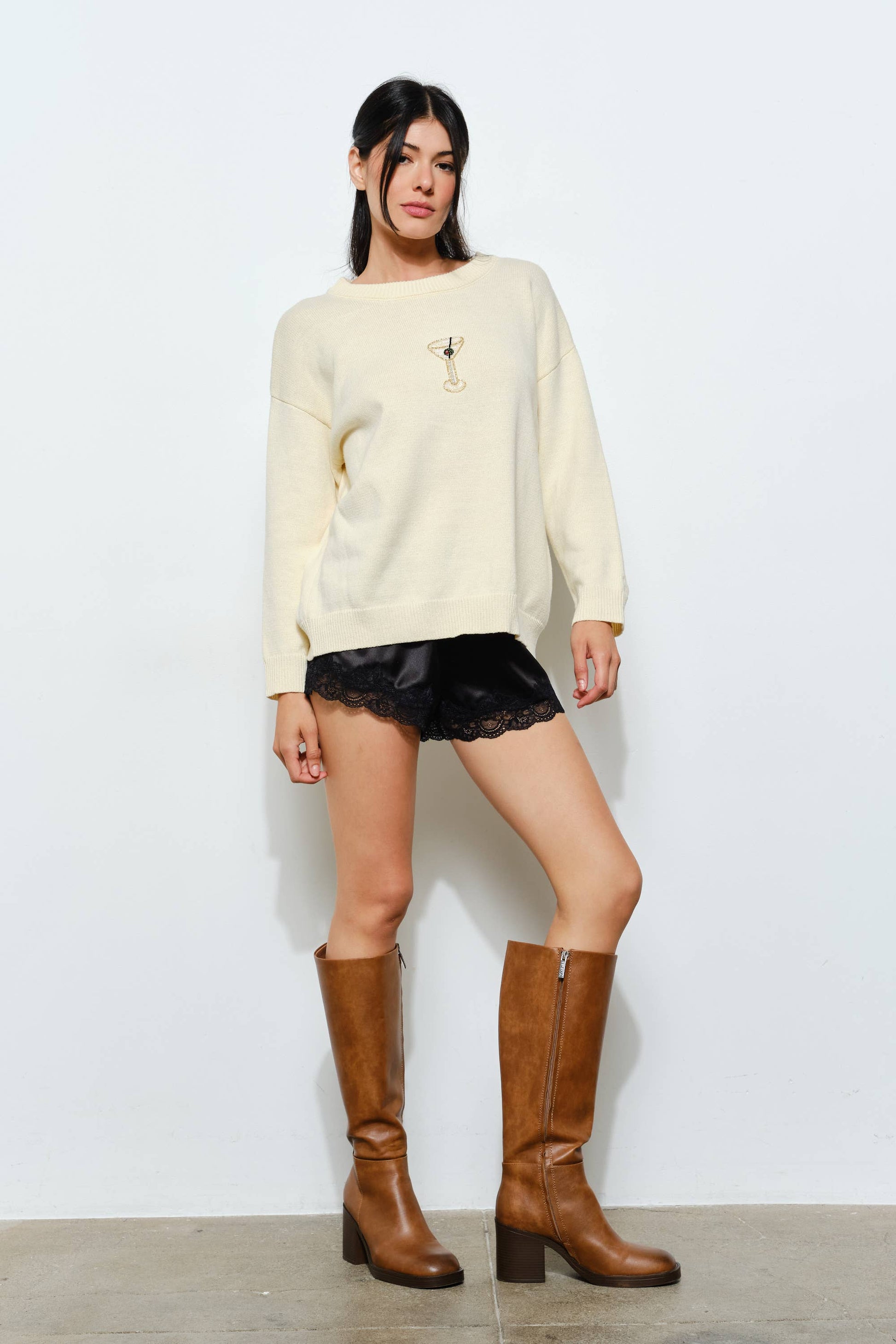 Keywords: martini bead sweater, knit statement sweater, oversized women's sweater, playful embroidery top, trendy women's fashion, cozy knitwear, long sleeve sweater, wholesale women's clothing, whimsical sweater